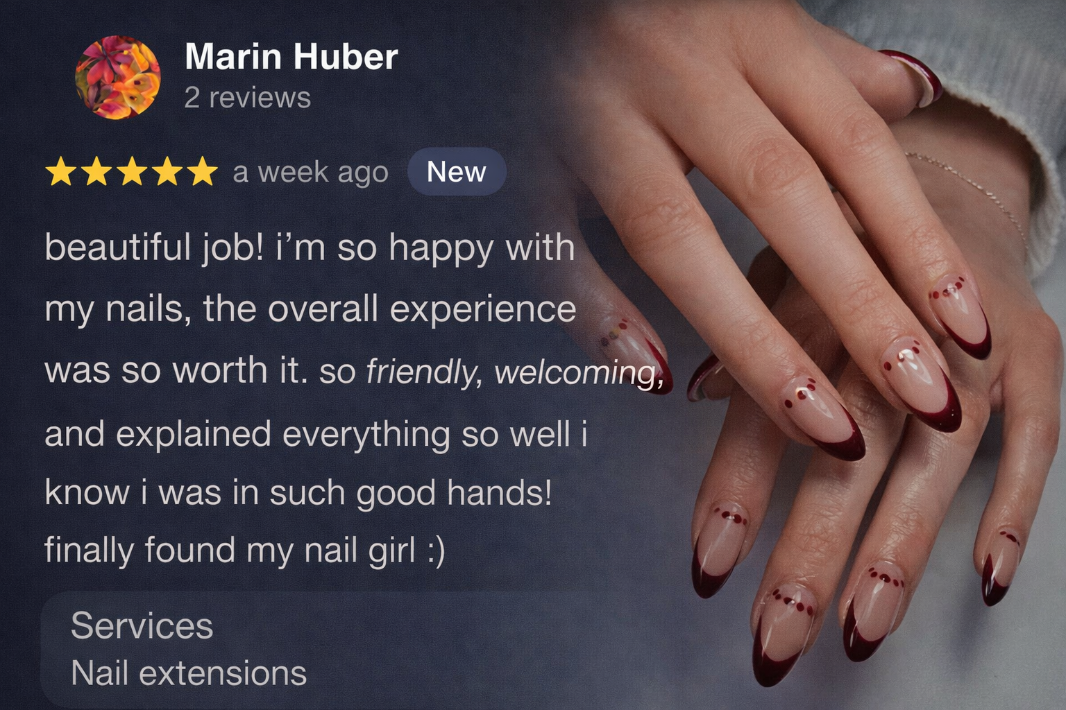 Luxury Nail Salon | Kelowna BC Specializing in Acrylic, Gel, & Gel-X Nail Extensions & Custom Nail Art Book Now Book Now ⭐⭐⭐⭐⭐ 5-Star Rated Nail Salon What Our Clients Say Read More Google Reviews Our Nail & Spa Services 𝐒𝐩𝐚 𝐌𝐚𝐧𝐢𝐜𝐮𝐫𝐞 & 𝐏𝐞𝐝𝐢𝐜𝐮𝐫𝐞 𝐓𝐫𝐞𝐚𝐭𝐦𝐞𝐧𝐭𝐬 𝐀𝐜𝐫𝐲𝐥𝐢𝐜, 𝐆𝐞𝐥, & 𝐆𝐞𝐥 𝐗 𝐍𝐚𝐢𝐥 𝐄𝐱𝐭𝐞𝐧𝐬𝐢𝐨𝐧𝐬 𝐂𝐡𝐢𝐥𝐝𝐫𝐞𝐧'𝐬 𝐒𝐞𝐫𝐯𝐢𝐜𝐞𝐬 𝐌𝐞𝐧’𝐬 𝐒𝐞𝐫𝐯𝐢𝐜𝐞𝐬 View All Services View All Services See More Nail Designs View Our Instagram View Our Instagram